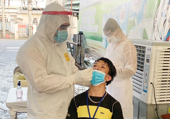 Các bác sĩ Quân Y tiến hành lấy mẫu cho công nhân tại Công ty Cổ Phần May Xuất Khẩu Hà Phong (Bắc Giang)