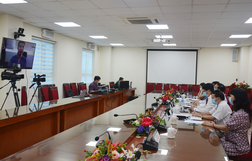 Đoàn chủ tọa hội thảo tại điểm cầu trung tâm điều hành hội thảo khoa học trực tuyến.