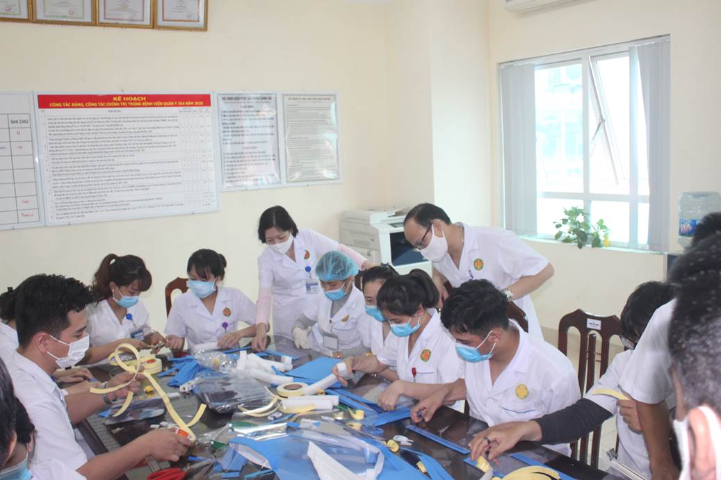 Trước thông tin dịch Covid-19 ngày càng diễn biến phức tạp, với tinh thần “Đâu cần thanh niên có, việc gì khó có thanh niên”, nhằm “chia lửa” với các đồng chí tuyến đầu phòng, chống dịch bệnh, ở bộ phận có nguy cơ phơi nhiễm cao như: Tổ kiểm soát thân nhiệt, Bộ phận lễ tân; Khoa Nội truyền nhiễm, Khoa Cấp cứu ban đầu, Khoa Khám bệnh, Khoa Chống nhiễm khuẩn, các đồng chí bác sĩ, điều dưỡng ở các khoa hằng ngày tiếp xúc bệnh nhân, bếp nhân viên, bếp bệnh nhân. Ban Chấp hành Đoàn cơ sở Bệnh viện đã cử các đoàn viên, thanh niên ở các chi đoàn xung kích làm mũ ngăn giọt bắn cùng hướng tới đẩy lùi dịch bệnh. Sau giờ giao ban buổi chiều các ngày 31/3 và 01/4/2020, Đoàn thanh niên Bệnh viện dành chút thời gian để tham gia làm mũ ngăn giọt bắn. Từ việc chuẩn bị vật liệu, thiết kế mẫu, dán thành một chiếc mũ hoàn thiện, đều do các đồng chí là bác sĩ, điều dưỡng, nhân viên tự tay làm. Dự kiến sẽ có 250-300 chiếc mũ được cấp phát cho các cán bộ, nhân viên y tế Bệnh viện.